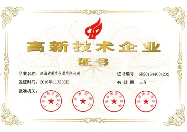 近日,珠海歐美克儀器有限公司收到廣東省科學技術廳、廣東省財政廳、廣東省國家稅務局和廣東省地方稅務局4機構聯合頒發的“高新技術企業”證書。“高新技術企業”,對于20多年致力于粒度測試行業的翹楚——珠海歐美克儀器來說,可謂實至名歸。