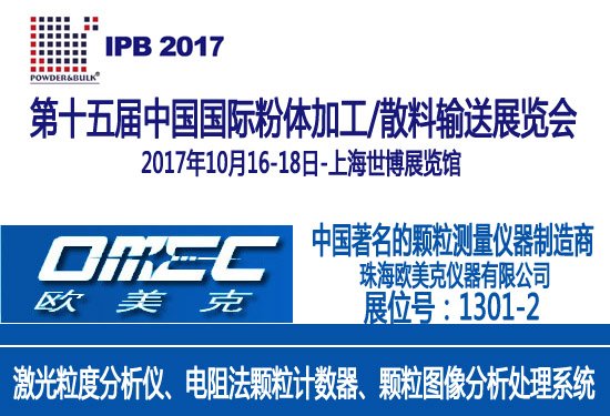 IPB 2017 第十五屆中國國際粉體加工/散料輸送展覽會將于2017年10月16-18日在位于上海浦東的上海世博展覽館舉行。珠海歐美克儀器有限公司將攜最新激光粒度分析儀產品參展,展位號:1301-2,歡迎蒞臨參觀、交流。