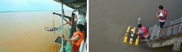 水文工作人員在河流湖泊進行水體采樣監測工作