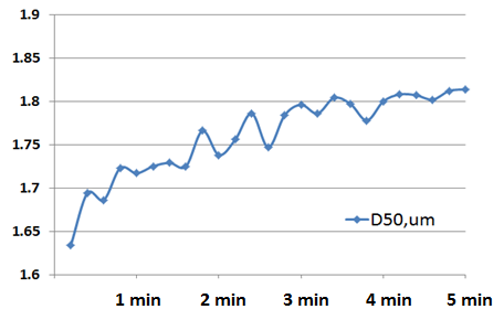 圖為農藥企業檢驗員實地操作歐美克LS-609型激光粒度分析儀我們選取了25%嘧菌酯水懸浮劑進行粒度測試,在加樣后每12秒一次連續監控其遮光比和特征粒徑D50的變化如下圖所示。