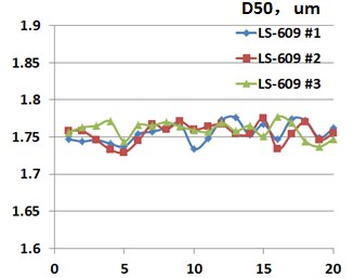 采用完全相同設置的SOP測量,例如自動排氣泡、折射率吸收率參數、泵速超聲等分散條件等,3臺LS-609激光粒度儀各對應的20位操作員的D50測試結果分別以紅綠藍色曲線顯示,所有結果均在1.76um附近小幅波動,3臺儀器測試結果D50最大最小值的偏差依次為2.4%、2.6%、2.3%,顯示了粒度儀在SOP測試的方式下明顯更小的質控風險。同時我們也發現,儀器與儀器之間結果也幾乎完全一致,詳情請看下表統計結果。