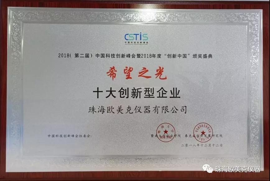 2018年12月,在由暨南大學創業學院、泰克威創新發展研究院組織的2018(第二屆)中國科技創新峰會暨2018年度“創新中國”頒獎盛典上,珠海歐美克儀器有限公司被評選為“希望之光十大創新型企業”。