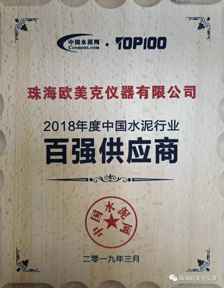 2019年3月,在由中國水泥網主辦的2019中國水泥產業峰會暨TOP100頒獎典禮上,珠海歐美克儀器有限公司被評選為“2018年度中國水泥行業百強供應商”。