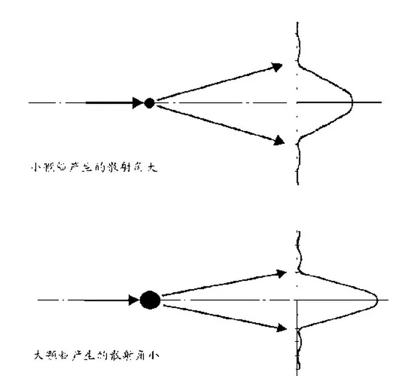 激光粒度儀系利用顆粒對光的散射(衍射)現象的原理,即光在行進過程中遇到顆粒(障礙物)時,會有一部分偏離原來的傳播方向;顆粒尺寸越小,偏離量越大;顆粒尺寸越大,偏離量越小,由此來鑒別顆粒大小分布(圖1)。