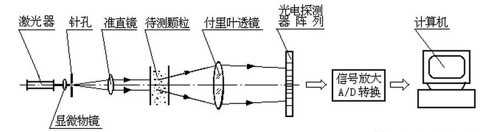 圖2為經典的激光粒度儀的原理結構。從激光器發出的激光束經顯微物鏡聚焦、針孔濾波和準直鏡準直后,變成直徑約10 mm的平行光束。該光束照射到待測的顆粒上,一部分光被散射。散射光經傅里葉透鏡后,照射到光電探測器陣列上。由于光電探測器處在傅里葉透鏡的焦平面上,因此探測器上的任一點都對應于某一確定的散射角。光電探測器陣列由一系列同心環帶組成,每個環帶是一個獨立的探測器,能將投射到上面的散射光能線性地轉換成電壓,然后送給數據采集卡。該卡將電信號放大,再進行A/D轉換后送入計算機。