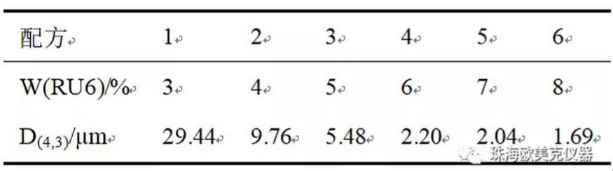 同樣,影響水乳劑穩定性的因素有許多,一般液滴尺寸范圍越窄越穩定,當平均粒子直徑相同時,單分散的水乳劑比多分散的水乳劑更穩定。目前可以借助激光粒度儀來監測。以40%乙草胺水乳劑為例。通過乳化效果實驗篩選了一種合適的乳化劑RU6,進而在確定該乳化劑的用量上采用激光粒度儀測定粒徑的方法,實驗結果如表2: