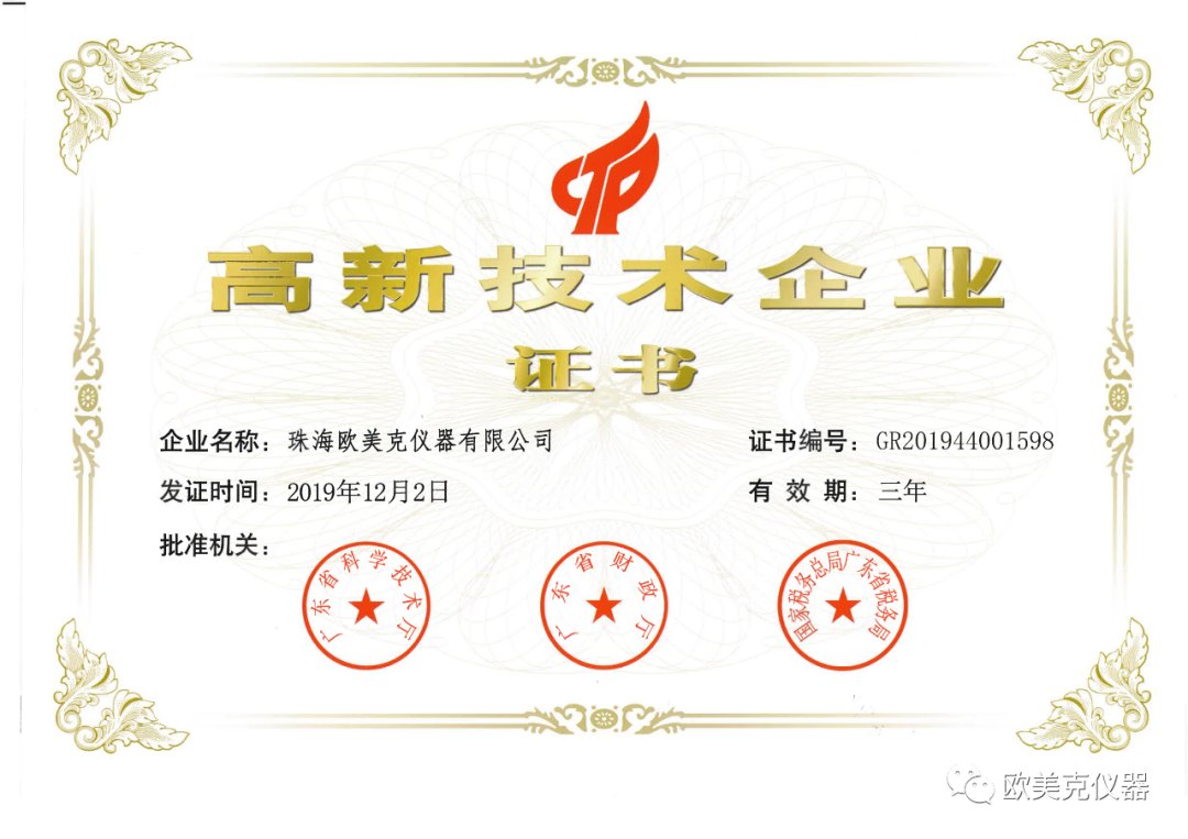 日前,珠海歐美克儀器有限公司再次順利通過由廣東省科學技術廳、廣東省財政廳、國家稅務總局廣東省稅務局聯合批準頒發的“國家高新技術企業”認定。同時,廣東省科學技術廳也將珠海歐美克儀器有限公司評定為“廣東省粒度粒形分析儀器工程技術研究中心”!