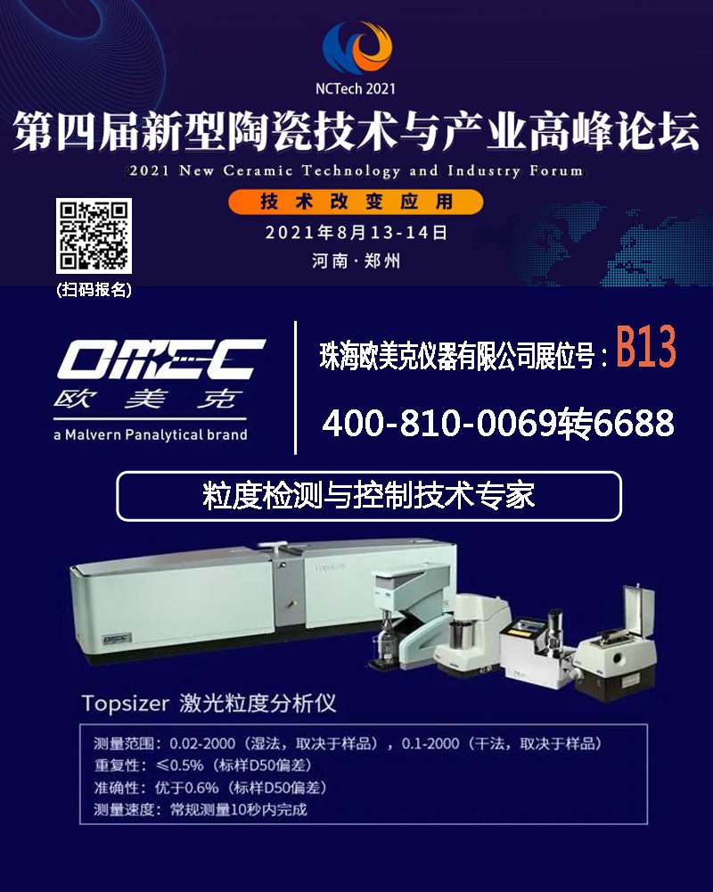 2021第四屆新型陶瓷技術與產業高峰論壇,2021年8月13-14日在鄭州·喆鵬酒店舉辦。珠海歐美克儀器有限公司作為展位贊助單位參與此次盛會。