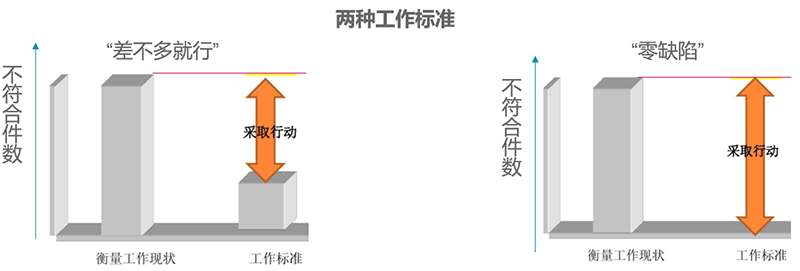 “符合要求,滿足客戶需求”,那些在制作合同標書時允許返工期;在物料來料檢驗時允許有一定比例的接收不良等這些“差不多就好”的工作方式和態度顯然是與“質量”背道而馳的。企業要在滿足客戶需求的質量之路上與競爭對手形成差距,取得越來越多客戶的認同,就必須要將“第一次就把正確的事情做正確”作為我們的工作準則,將“質量零缺陷”作為我們的工作標準。