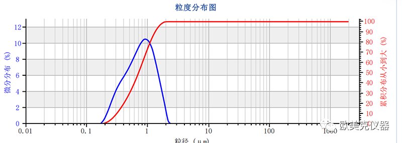 上圖中,激光粒度儀測試結果下圖納米粒度儀的結果是來自同一個樣品,從分布圖和數據重現程度上看,1μm以下,納米粒度儀分辨能力優于激光粒度儀;1μm以上顆粒的量的測試,激光粒度儀測試重現性優于納米粒度儀;同時對于這樣的少量較大顆粒,動態光散射納米粒度儀在技術上更敏感(測試的光能數據百分比更高)。