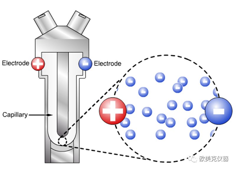 納米顆粒大多有較活潑的電化學特性,納米顆粒在介質中滑動平面所帶的電位被稱為Zeta電位。當在樣品上加載電場后,帶電顆粒被驅動做定向地電泳運動,運動速度與其Zeta電位的高低和正負有關。與測量布朗運動類似,納米粒度儀可以測量電場中帶電顆粒的電泳運動速度表征顆粒的帶電特性。