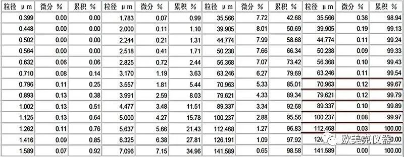 可以看到對于體積含量在0.5%以下的極少量60-100μm的顆粒,以及體積含量在1%左右的2μm以下顆粒,均能夠靈敏的檢測出來其詳盡的粒度分布。顯示了Topsizer對粉體材料的大、小顆粒具有高超的分辨能力,對于下游應用中電池產品的安全性能和容量性能有更準確的指導意義。